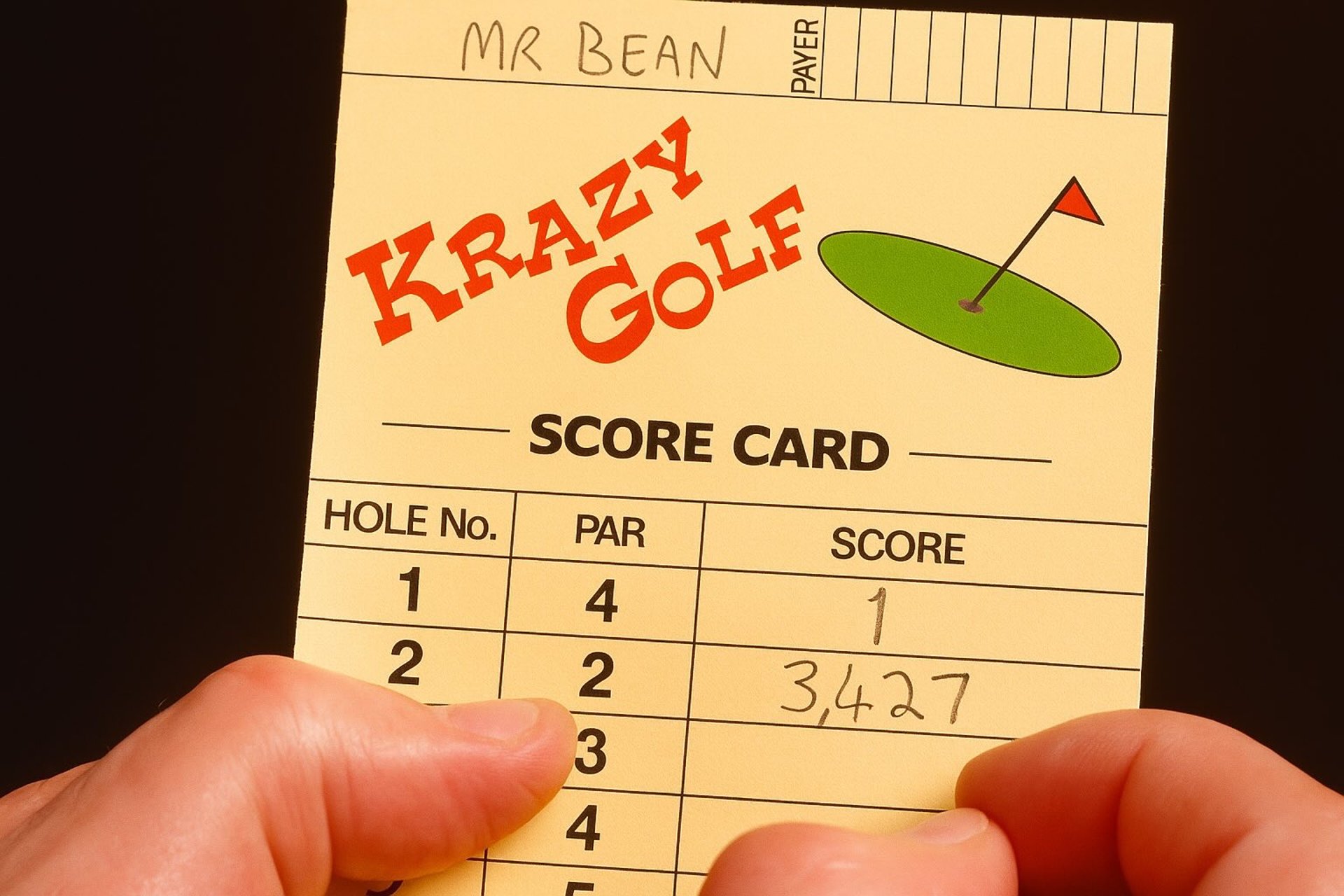 Alors que la nuit est tombée et que le mini-golf ferme ses portes, Mr. Bean revient avec son morceau de pelouse ; le place face au trou N°2 et marque son point ! Soulagé et heureux, il remplit la carte des scores avec … 3427 coups. (Persévérant)