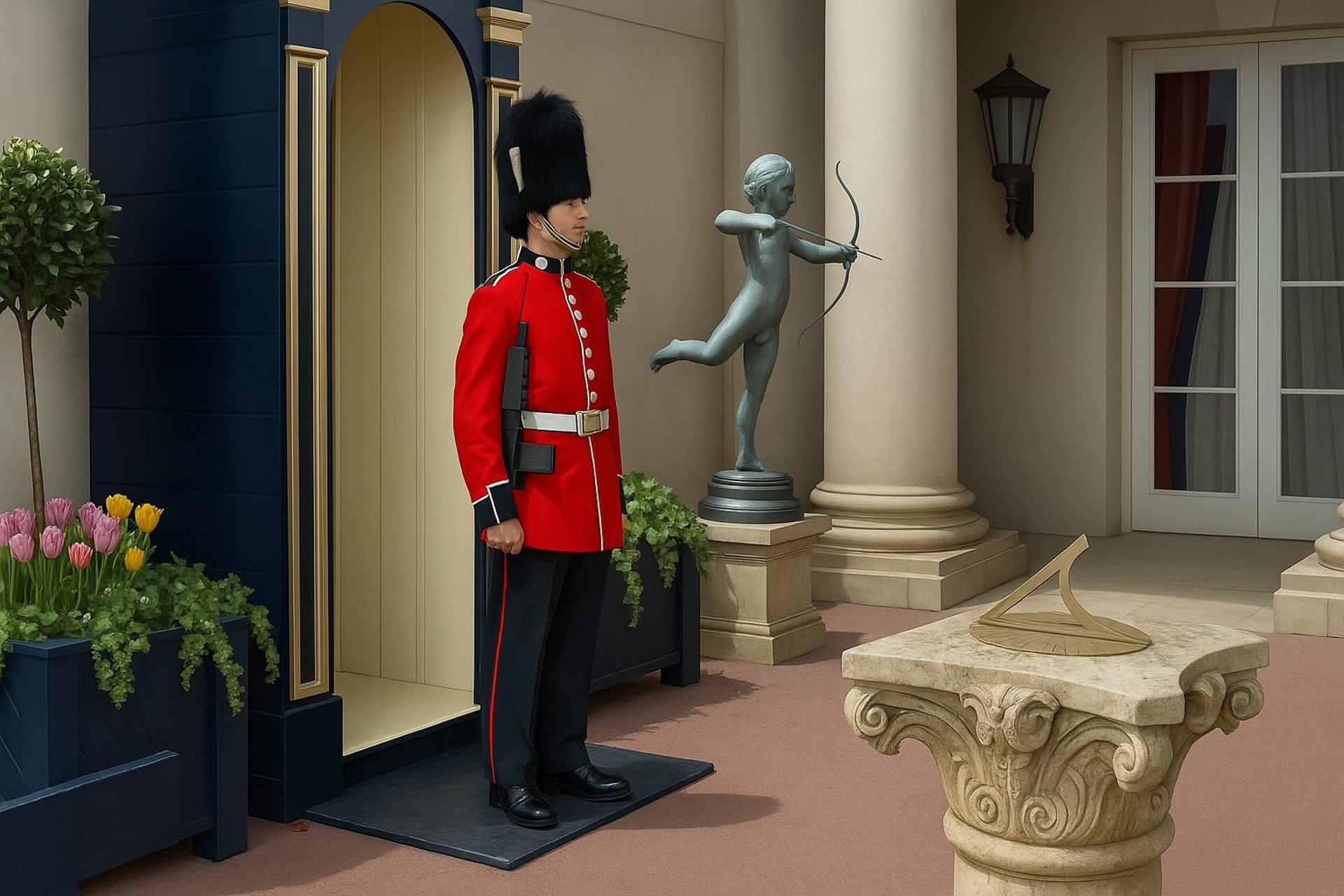 Il ira jusqu’à lui couper grossièrement la moustache, le décorant de fleurs et accrochant Teddy au bout de son fusil. Le garde restera impassible face à la situation. Mr. Bean prépare le minuteur de son appareil pour la photo mais le garde est appelé par son supérieur et se met en marche au moment où l’appareil photo se déclenche. (Perturbateur, inconscient)