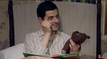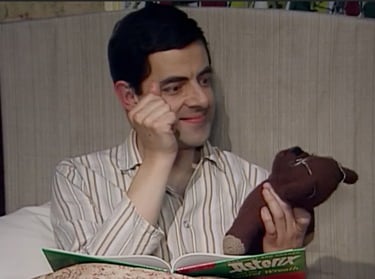 De retour à l’appartement Mr. Bean lit une BD avec Teddy, qui, après s’être endormi, est placé dans une boite à chaussures sous le lit. (Solitaire et enfantin)