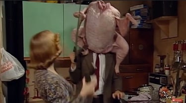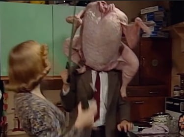 Alors qu’il prépare l’immense dinde gagnée la veille avec de la farce, Mr. Bean perd sa montre dans cette dernière. Irma sonne à la porte et Bean lui ouvre tant bien que mal. Elle s’effondre en voyant Mr. Bean, la tête dans la dinde et une scie à la main. (Distrait)