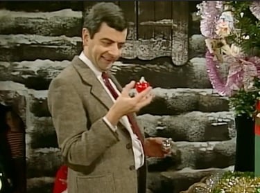 Jour de Noël, Mr. Bean ouvre les cadeaux : une paire de chaussettes pour lui, des yeux pour Teddy et un morceau de fromage sur un piège pour les souris. (Génie)